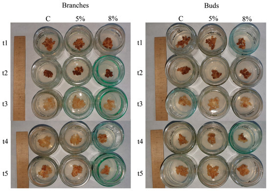 The viability of the callus cultures (VC) was assessed by the timing of the first appearance of necrotization signs and by the timing of the cultures’ death over the 4-month incubation period (Table 3). Areas of necrosis during the cultivation process were found on the plant material of all five trees. The earliest appearance of necrotic areas was detected in the culture obtained from the buds and branches of the t1 explant and the buds of the t2 explant (at 2–3 weeks of cultivation). The necrotization of culture cells obtained from the buds and branches of the t5 explant and the branches of the t4 explant occurred much later. The cultures obtained from the t1 and t2 trees were characterized by their complete death within 4 months of the cultivation period. Thus, over 4 months of cultivation, complete death was recorded in 15% of the calli obtained from the bud explants of t1, 24% of the calli obtained from the branch explants of t1, 4% of the calli from the buds of t2, and 27% of the calli from the branches of t2. The analysis of callusogenesis showed that the callus cultures obtained from different trees and different origins differed significantly in growth and development parameters.