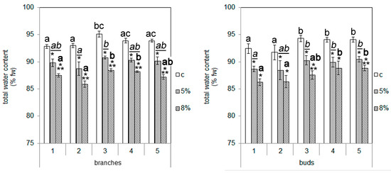 The influence of PEG concentrations on total water content in cells of callus cultures. The digits represent numbers of the trees that were used as sources of plant material for callus induction. The means and standard errors of the mean are shown (n = 3–6). * indicates significance differences among control (c) and treatment (5 or 8% PEG); ** indicates significance differences among treatments (p < 0.05). Different letters indicate significance differences among calli obtained from different trees at p < 0.05 (the regular font corresponds to control; the underlined italic font corresponds to 5% PEG; the bold font corresponds to 8% PEG). fw—fresh weight.