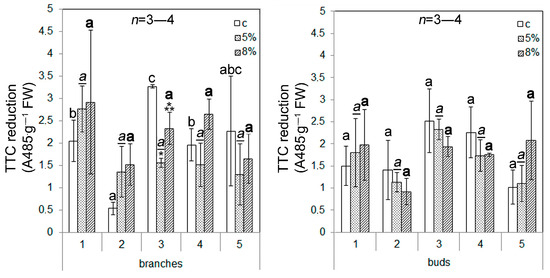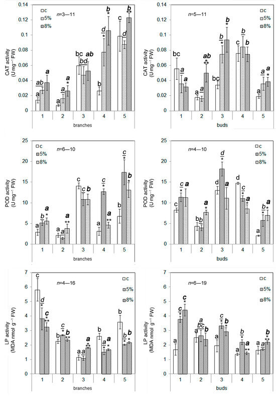 Under the control conditions, the highest lipid peroxidation (LP) activity among the calli obtained from buds was recorded in the t2 sample; among the cultures obtained from branches, the LP activity was low in the t3 sample and increased in the t1 and t5 samples (Figure 5). After the addition of PEG to the culture media, the t2 and t3 cell cultures (branches) and t1, t3, t4, and t5 cultures (buds) were found to have increased LP activity. The differences between cultures with increased LP activity were expressed as the increase in LP in response to the 5% PEG treatment (the t2 branches and t4 buds) or in response to the 8% PEG treatment (the t3 branches and t5 buds), or the calli in which both PEG doses had the same effect (the branches of t4 and t5 and the buds of t1 and t3). The decrease in LP activity under WD was recorded in the branches of the t1, t4, and t5 callus cultures. In the t2 cells (buds), changes in LP activity were not observed.