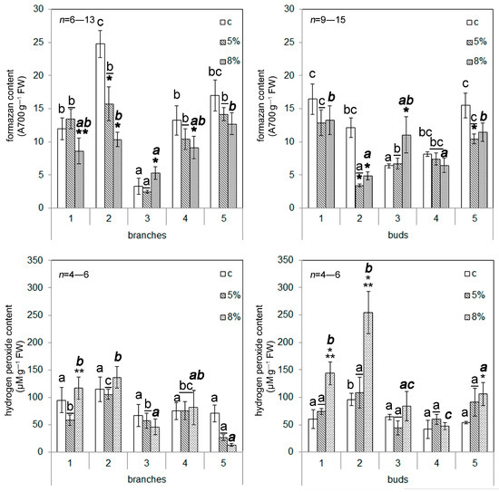 The influence of water deficit (WD) on hydrogen peroxide content and superoxide anion content in callus culture cells. The digits represent numbers of the trees that were used as sources of plant material for callus induction. The means and standard errors of the mean are shown. * indicates significance differences among control (c) and treatment (5 or 8% PEG); ** indicates significance differences among treatments (p < 0.05). Different letters indicate significance differences among calli obtained from different trees at p < 0.05 (the regular font corresponds to control; the underlined italic font corresponds to 5% PEG; the bold font corresponds to 8% PEG). FW—fresh weight.