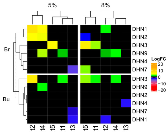 Heatmap of DHN gene expression log2-fold changes (LogFC) in calli under PEG treatment in relation to control conditions. Br—sample calli initiated from branch tissues; Bu—sample calli initiated from bud tissue; 5% and 8% are percentages of PEG added to growth media for WD induction. t1–t5 represent different trees used for callus culture initiation. Three independent biological replicates were used, and only results with significant expression differences (Pt-test < 0.05) from control conditions are shown. ACT-1 expression is used for normalization.