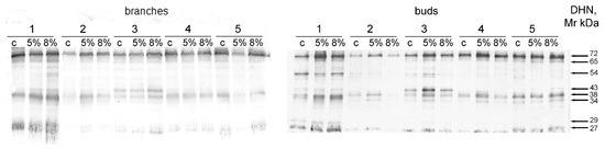 Gel electrophoresis followed by Western blotting and the use of specific antibodies made it possible to identify eight DHNs in the callus cultures growing under the control conditions. These were DHNs with masses of 72, 54, 47, 43, 38, 34, 29, and 27 kDa (Figure 7). Among the listed DHNs, only proteins with masses of 72, 47, 38, and 27 kDa were detected in all of the studied samples. The 43 kDa DHN was clearly detected only in the t3sample (branches and buds), and the 54 kDa DHN was detected in the t1 cells and, to a lesser extent, in the cells of t3 and t5 (buds) and those of t3 and t4 (branches).