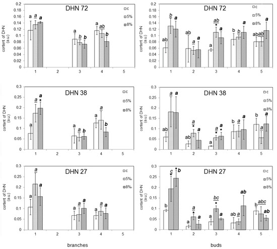 The RT-qPCR method was used to compare the transcript levels of DHN genes in the calli induced from branches and buds cut from five different Scots pine trees under control conditions in relation to the ACT-1 transcript level (Figure 6). Primers for eight DHN genes were used, only six of which allowed us to obtain the corresponding PCR products: DHN1, DHN2, DHN3, DHN4, DHN7, and DHN9 (see Materials and Methods).