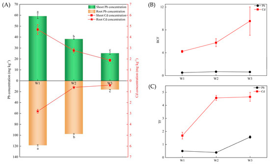 Plant samples were washed with distilled water to remove traces of surface elements, then divided into roots and shoots and oven-dried at 65 °C for 48 h to constant weight. Then, each sample was crushed to a fine powder with a mortar and pestle, and 0.2 g roots/shoots powders were digested with 5 mL HNO3 (65%) at 110 °C for 2 h, then cooled and mixed with 1 mL H2O2 (30%, v/v) and boiled for 1 h. Finally, the digests were diluted to 50 mL with triple deionized water in a volumetric flask. Triplicates were prepared for each sample. The concentrations of Pb and Cd in the samples were determined by flame atomic absorption spectrometry [41]. The quality control was conducted using the GBW100348 plant standard material of the National Institute of Metrology, China [42]. The Biological Concentration Factor (BCF) of each organ of the plant and Transfer Factor (TF) were calculated according to the following equations [43,44]: