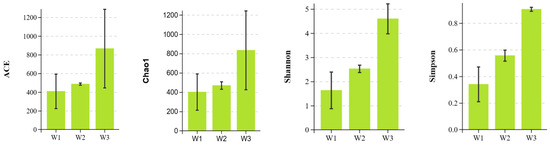 The bacterial communities of nine plant samples were analyzed using Illumina sequencing. The dataset of nine samples consisted of 609,594 unique 16S rDNA gene tags. Bacterial abundance in plant samples was assessed through α diversity (ACE, Chao1, Shannon, and Simpson) analysis (Figure 2). The ACE and Chao1 indices were used to determine the predicted number of OTUs in the plant samples, which reflects the species richness of the sample communities. The Shannon and Simpson indices were used to evaluate the evenness and richness of microbial communities. The figure illustrates that α diversity increased as heavy metal content decreased, with the lowest value observed in sample W1.