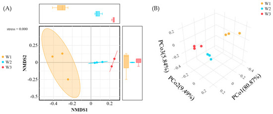 Based on the Bray–Curtis distance between the samples, NMDS and PCoA analyses of the plant bacterial communities in the three sample sites were performed using the R language (Figure 3). NMDS ordination shows the existence of significant differences in the composition of entire bacterial communities at the OTU level between the three types of areas (stress = 0.000, p < 0.05), especially between the tailing area and undisturbed area and between the remediation area and undisturbed area (Figure 3A), which is also clearly indicated by the 3D PCoA pattern (PCo1, PCo2, and PCo3 explained 80.87%, 9.49%, and 5.84% of the variance, respectively) (Figure 3B). These results indicate that there was a significant difference in the composition of plant endophyte communities between the three types of habitats.