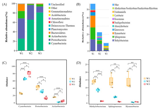 Figure 4 displays the bacterial community structure in plant samples at the phylum and genus levels. The dominant phyla in the plant samples were Cyanobacteria and Proteobacteria (Figure 4A), accounting for over 60% of the total abundance. The relative abundance of Cyanobacteria (25.44%) was significantly lower than that of W2 (65.59%) and W3 (80.68%) in sample plot W1, while the relative abundance of Proteobacteria (42.92%) was significantly higher than that of W2 (30.89%) and W3 (12.85%). Methylobacterium, Sphingomonas, and Hymenobacter were the dominant genus in the plant samples (Figure 4B), with their relative abundance being significantly higher in W1 (13.96%, 14.32%, and 14.23%, respectively) compared to W2 (8.46%, 3.93%, and 0.56%) and W3 (1.27%, 0.87%, and 0.77%).