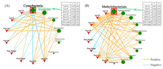 Pearson correlation analysis verified the correlation between environmental heavy metal content and plant physiological characteristics with plant endophyte communities (Figure 5). At the phylum level (Figure 5A), Cyanobacteria showed a significant negative correlation (p < 0.01) with environmental heavy metal content and a significant positive correlation (p < 0.01) with plant height and biomass. Proteobacteria showed a significant positive correlation (p < 0.01) with environmental heavy metal content and a significant negative correlation (p < 0.01). At the genus level (Figure 5B), Methylobacterium and Sphingomonas showed a significant positive correlation (p < 0.01) with environmental heavy metal content and a significant negative correlation (p < 0.01) with plant height and biomass. In contrast, Cyanobacteria and Methylobacterium showed a more significant correlation with heavy metal content in plants and soil.