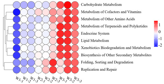 The study determined the functional abundance of bacterial communities in plants from three sample plots using 16S rDNA gene amplicon data and Tax4Fun (Figure 6). Several pathways were significantly enriched in the phytobacterial community in sample plot W3 (p < 0.05), including genes associated with metabolism (carbohydrate metabolism, lipid metabolism, metabolism of cofactors and vitamins, and so on), genetic information processing (folding, sorting, degradation, replication, and repair), and organismal systems (endocrine system). Furthermore, the phytobacterial community in the W3 sample showed significant enrichment in nearly all secondary metabolic pathways. In addition, the abundance of bacterial metabolic functions varied among plants from different contaminated sites, depending on the concentration of heavy metals. The data indicate that there is a correlation between high microbial metabolism and low heavy metal concentrations in plants. Additionally, the study found that robust microbial metabolism was linked to decreased levels of heavy metals in both soil and plants.