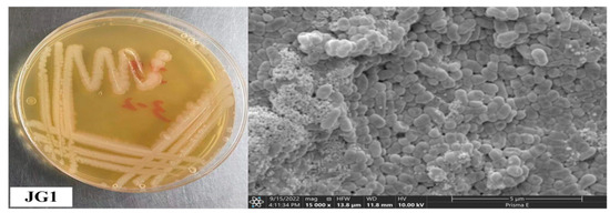A total of 30 culturable bacterial endophytes were isolated. Among them, 12 strains with growth-promoting effects were screened out through plate culture experiments of dissolving phosphorus, fixing nitrogen, and dissolving potassium. The results of the pot test showed that JG1 had the most significant plant growth promotion ability. JG1 was identified as Serratia marcescens FZSF02. Figure 7 shows colony growth images and cell morphology electron microscopy images.