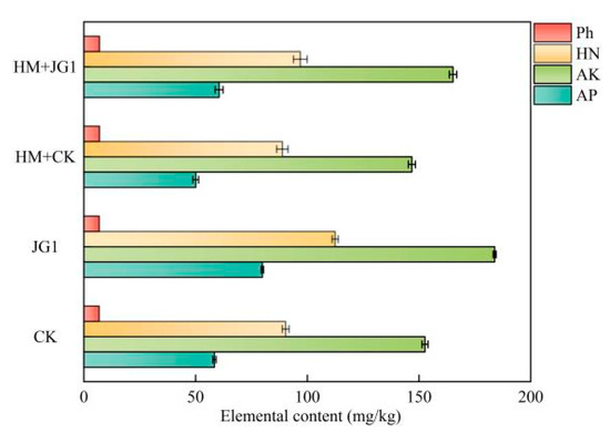 Soil nutrient concentrations are demonstrated in Figure 9. The figure shows that JG1 significantly improved the physical and chemical properties of the soil. In the treatment group where heavy metals were not added, the soil’s AP, AK, and HN were significantly increased by 36.70%, 20.41%, and 24.52%, respectively, compared to the CK. The pH did not change significantly. After the addition of heavy metals, the JG1 treatment group showed a general increase of 20.87% in AP, 12.55% in AK, and 9.03% in HN compared to the CK group. Additionally, the pH increased from 6.82 to 6.88. These results suggest that JG1 has a positive effect on soil physical and chemical properties.