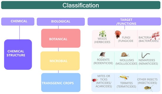 Pesticides and biopesticides can be classified according to (i) their source as chemical or biological. They are also classified depending on (ii) their targets, or the functions they perform. In this context, they range from those employed in the control of weeds (herbicides), algae (algicides), fungi (fungicide), mites or ticks (miticides/acaricides), bacteria (bactericides), rodents (rodenticide), termites (termiticides), insects (insecticides), mollusks (molluscicides), and nematodes (nematicides). Figure 1 summarizes the pests that are relevant for plants.