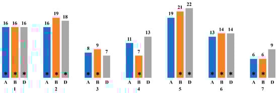 The distribution of the genes characterized as involved in photosynthesis along the chromosomes of T. aestivum based on the NCBI Genes database (https://www.ncbi.nlm.nih.gov/gene (accessed on 5 June 2024)). * indicates chromosomes on which loci associated with ChlF parameters and chlorophyll content have been identified; the letters A, B and D indicate genomes; 1–7 indicate chromosomes; the number of genes described is indicated by the numbers above the corresponding columns.