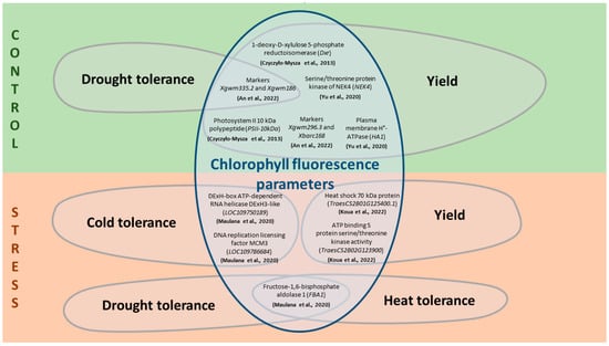 Relationship between ChlF parameters and significant breeding traits through some candidate genes under control and stress conditions for T. aestivum. The scheme is based on data from [127,129,132,133,135], a detailed description of the measured ChlF parameters and associated genes is described in Table S1.