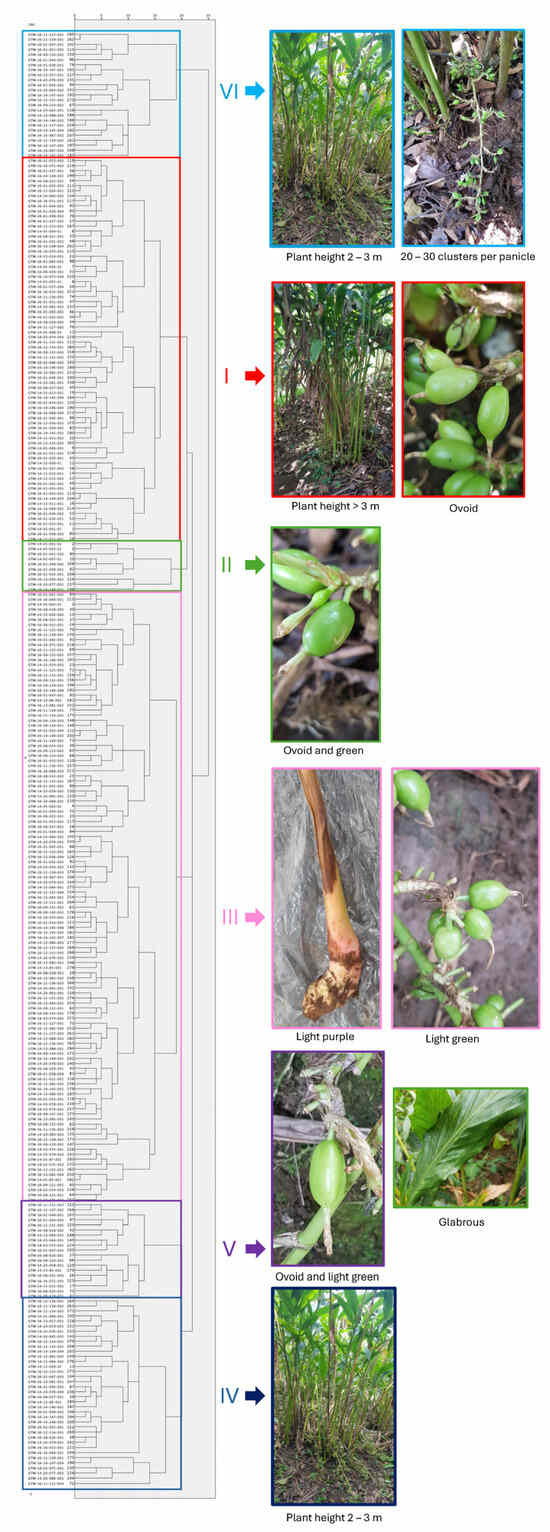 A hierarchical cluster analysis was conducted using the first three PCs to classify 288 cardamom accessions, which were categorized into six distinct groups (Figure 1). The diversity index assessed using the Shannon–Wiener genetic diversity index (H’) by considering the groups was relatively high, with a value of 1.28 (Table 4). The main properties of each group were as follows: