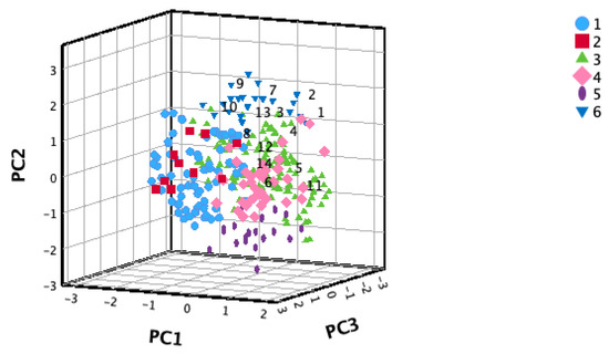 Selected cardamom accessions (1–14) classified into clusters (1–6) through hierarchical cluster analysis, utilizing the 3 principal components (PCs) derived from 17 morphological traits across 288 cardamom accessions.