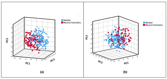 According to the plant descriptors provided by IPGRI, cardamom (Elettaria cardamomum (L.) Maton) can be divided into three putative foreign “natural cultivars”: (1) ‘Malabar’, (2) ‘Mysore’, and (3) ‘Vazhukka’. This third cultivar exhibits intermediate properties between the first two cultivars. Plant height plays a crucial role in determining the classification within the proposed varieties [22]. Accessions of cardamom were classified based on their height, with those below 3 m categorized as ‘Malabar’ and those exceeding 3 m as ‘Mysore’/‘Vazhukka’. Using the first three PCs, the graphical representation of this putative cultivar categorization (Figure 3a) differentiated the two groups on PC1, where plant height was a significant morphological trait (Table 2).
