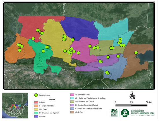 Currently, the principal production of cardamom is geographically concentrated within the North Transversal Stripe, encompassing several departments, namely Alta Verapaz, Baja Verapaz, Izabal, Huehuetenango, and Quiché [7,8,9]. In 2011, a critical constriction occurred due to an infestation by the thrips species Scriothrips cardamomi, which at its apex, affected approximately 90% of plantations [10]. Despite these formidable challenges, Guatemala continues to be one of the foremost producers and exporters of cardamom. This is attributed largely to the spice’s scant inclusion in local market [11]. In 2022, it was reported that exports exceeded USD 450 million and up to 45 thousand tons per year [8]. The cardamom industry has become a cornerstone of economic stability and a source of employment for a multitude of smallholder farmers and their dependents [12,13].