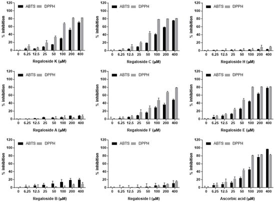 Free radical scavenging activities of the eight regalosides. The cationic and anionic radical scavenging activities of each individual chemical were determined using ABTS and DPPH assays, respectively. Ascorbic acid was used as a positive control for both assays (n = 2).