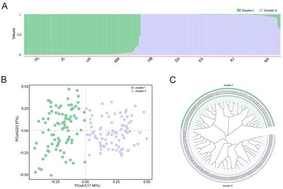 - Pritchard, J.K.; Stephens, M.; Donnelly, P. Inference of population structure using multilocus genotype data. Genetics 2000, 155, 945–959. [Google Scholar] [CrossRef]