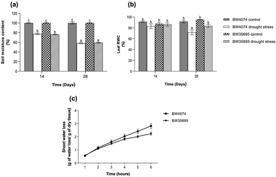 Soil moisture content, relative water content, and shoot water loss in potted wheat plants exposed to drought stress treatment. (a) Soil moisture content (n = 3); (b) leaf relative water content (RWC; n = 4); (c) relative shoot water loss (n = 5). Two-week old plants of BW4074 (drought-susceptible) and BW35695 (drought-tolerant) wheat varieties were exposed to drought stress by withholding water for 28 days and samples were harvested at the indicated time points for the respective measurements. Data presented as mean ± SE. Different letters indicate significant differences between means at (p ≤ 0.05) according to ANOVA and Tukey–Kramer test.