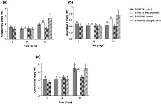 Effects of drought stress on chlorophyll and carotenoid content of wheat. (a) Chlorophyll A; (b) chlorophyll B; (c) carotenoid content. Two-week old plants of BW4074 (drought-susceptible) and BW35695 (drought-tolerant) wheat varieties were exposed to drought stress by withholding water for 28 days and samples were harvested at the indicated time points for the respective measurements. Data presented as mean ± SE (n = 3). Different letters indicate significant differences between means at (p ≤ 0.05) according to ANOVA and Tukey–Kramer test.