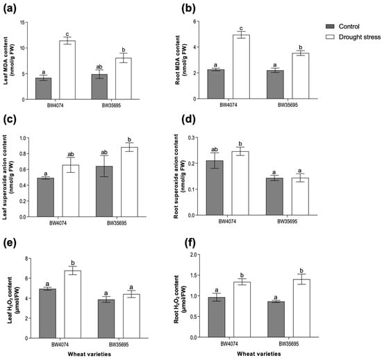 Since oxidative stress is a secondary stress of many environmental factors, including drought, we evaluated lipid peroxidation levels and ROS contents in leaves and roots of both wheat varieties following 28 days of drought stress (Figure 3). In this study, malondialdehyde (MDA) content was used as a proxy for lipid peroxidation, while ROS contents were used to assess the extent of oxidative stress. Compared to their respective well-watered controls, the drought-stressed BW4074 plants exhibited a 118 and 172% increase in leaf and root MDA content, respectively (Figure 3a,b). For the drought-tolerant BW35695, the MDA content increased by a modest 64% and 60% in leaves and roots following drought stress, respectively, and this increase was only statistically significant in the root tissue (Figure 3a,b).
