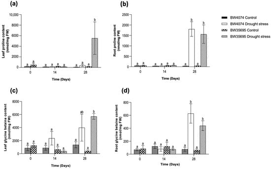 Effects of drought stress on proline and glycine betaine content of wheat plants. Levels of (a) leaf proline; (b) root proline; (c) leaf glycine betaine content; (d) root glycine betaine. Two-week old plants of BW4074 (drought-susceptible) and BW35695 (drought-tolerant) wheat varieties were exposed to drought stress by withholding water for 28 days and samples were harvested at the indicated time points for the respective measurements. Data presented as mean ± SE (n = 3). Different letters indicate significant differences between means at (p ≤ 0.05) according to ANOVA and Tukey–Kramer test.