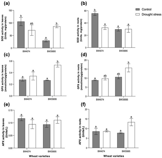Effects of drought stress on antioxidant enzyme activities of wheat plants. Enzymatic activities of (a) leaf superoxide dismutase (SOD); (b) root SOD; (c) leaf guaiacol peroxidase (GPX); (d) root (GPX); (e) leaf ascorbate peroxidase (APX); and (f) root APX. Two-week old plants of BW4074 (drought-susceptible) and BW35695 (drought-tolerant) wheat varieties were exposed to drought stress by withholding water for 28 days for the various measurements. Data presented as mean ± SE (n = 3). Different letters indicate significant differences between means at (p ≤ 0.05) according to ANOVA and Tukey–Kramer test.