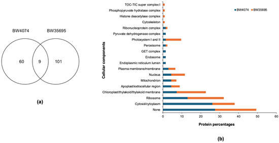 Total number of drought-responsive leaf proteins of two wheat varieties and their putative cellular locations. (a) A Venn diagram of the drought-responsive leaf proteins of two wheat varieties. (b) Gene ontology terms for cellular locations retrieved from the UniProt database. BW4074 is drought susceptible, while BW35695 is drought tolerant.