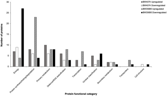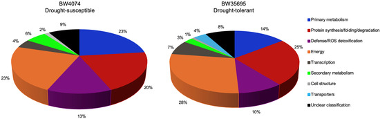 To understand the functional roles of the identified differentially expressed leaf proteins in drought response, we used the GO data and protein family names (Tables S6 and S7) to group proteins into theoretical functional categories (Tables S6 and S7; Figure 7). For this task, we mainly followed the classification scheme suggested by Bevan et al. [48]. The 110 drought-responsive leaf proteins of BW35695 had putative functions in energy (28%), protein synthesis/folding/degradation (25%), primary metabolism (14%), defense/ROS detoxification (10%), transcription (7%), transporters (4%), secondary metabolism (3%), and cell structure (1%). Likewise, the 69 drought-responsive leaf proteins of BW4074 had putative functions in primary metabolism (23%), energy (23%), protein synthesis/folding/degradation (20%), defense/ROS detoxification (13%), transcription (4%), secondary metabolism (6%), and cell structure (2%). However, 9% and 8% of the differentially expressed proteins for BW4074 and BW35695 had limited GO data to facilitate their functional grouping and thus remained unclassified (Tables S6 and S7; Figure 7). The transporters’ functional group with four (4%) proteins was only present in the proteome of BW35695 (Figure 7).
