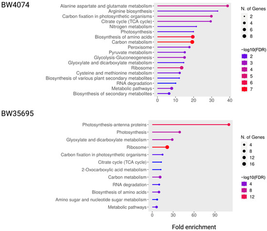 KEGG pathway enrichment analysis of drought-responsive leaf proteins of wheat. BW4074 is drought susceptible, while BW35695 is drought tolerant. The significance of the KEGG path is based on the Student’s t-test (p ≤ 0.05). The sizes of dots represent the number of genes in each pathway at a scale indicated by the legend within the graphics. To correct for multiple testing, False Discovery Rate (FDR) was calculated using the Benjamini–Hochberg method, and the measure of FDR is indicated by the colors at the logarithmic scale provided in the legend within the graphics.