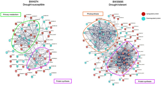 To identify the interactions between drought-responsive leaf proteins of BW4074 and BW35695 wheat varieties, a protein–protein interaction analysis was conducted using the STRING (Search Tool for the Retrieval of Interacting Genes/Proteins) database. Primary metabolism and protein synthesis were the two main interacting biological processes for BW4074, whilst photosynthesis and protein synthesis emerged as the two main interacting functional groups for BW35695 (Figure 10). The abundance of the leaf proteins involved in the photosynthesis functional group decreased following drought stress treatment as indicated by blue nodes. In the protein synthesis category, the majority of the proteins were upregulated in response to drought stress as represented by red nodes, and only two ribosomal proteins, A0A341U912 and W5D067, were downregulated. Overall, the protein–protein interaction maps suggest wheat plants under drought stress modulate various biological processes by altering the expression levels of proteins. These stress-responsive proteins associate with each other to varying degrees to coordinate the desired response mechanism; such protein interactions may also differ between wheat plants of contrasting drought phenotypes.