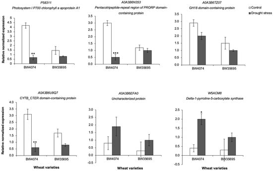 For the rest of the targets (Figure 11), the qRT-PCR data revealed that differential expression is either controlled post-transcriptionally or that the time points where transcript abundance aligns with protein abundance are different. For instance, the iTRAQ data showed that the Photosystem I P700 chlorophyll A apoprotein A1 with accession P58311 and the CYTB_CTER domain-containing protein with accession A0A3B6U9Q7 were highly downregulated in BW35695 (Table S7), but not listed among the drought-responsive proteins of BW4074 (Table S6). Nonetheless, gene expression data revealed that both genes, P58311 and A0A3B6U9Q7, were downregulated in both wheat varieties but were only statistically significant in the drought-sensitive BW4074 (Figure 11). Similarly, the GH18 domain-containing protein (A0A3B6TZ07) and the Uncharacterized protein (A0A3B6EFA0) genes did not show any significant change in expression following the drought treatment in both wheat varieties (Figure 11), yet their corresponding proteins were highly upregulated in BW35695 during drought stress (Table S7). Overall, our qRT-PCR analysis suggests that the drought-induced upregulation of the delta-1-pyrroline-5-carboxylate synthase (W5ACM8) protein observed in BW4074 (Table S6) is transcriptionally regulated under the experimental conditions of this study. The other five protein targets used in gene expression (Figure 11) could either be post-transcriptionally regulated or the abundances of the proteins and transcripts differentially accumulate at different time points.