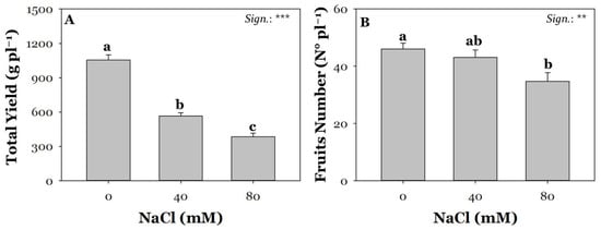Effect of saline irrigation with three NaCl levels (0, 40, 80 mM) on total yield (A) and fruit number (B). Mean comparisons were performed by Tukey’s HSD post-hoc test. Different letters within each column indicate significant differences between means (p ≤ 0.05). ** and *** denote significant effects at p ≤ 0.01 and p ≤ 0.001, respectively (n = 3).