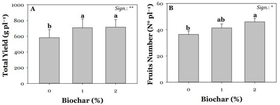 Effect of biochar treatment at three different concentrations (0, 1, and 2%) on total yield (A) and fruit number (B). Mean comparisons were performed by Tukey’s HSD post-hoc test. Different letters within each column indicate significant differences between means (p ≤ 0.05). * and ** denote significant effects at p ≤ 0.05 and p ≤ 0.01, respectively (n = 3).