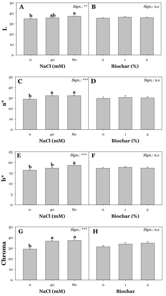 Effect of saline irrigation with three NaCl levels (0, 40, 80 mM) and effect of biochar treatment at three different concentrations (0, 1, and 2%) on CIELab color space parameters: L (A,B), a* (C,D), b* (E,F), and chroma (G,H). Mean comparisons were performed by Tukey’s HSD post-hoc test. Different letters within each column indicate significant differences between means (p ≤ 0.05). ** and *** denote significant effects at p ≤ 0.01 and p ≤ 0.001, respectively (n = 3).