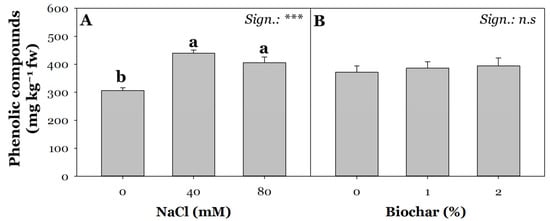 Effect of saline irrigation (A) with three NaCl levels (0, 40, and 80 mM) and biochar treatment (B) at three different concentrations (0, 1, and 2%) on phenolic compounds. Mean comparisons were performed by Tukey’s HSD post-hoc test. Different letters within each column indicate significant differences between means (p ≤ 0.05). n.s. and *** denote non-significant and significant effects at p ≤ 0.001, respectively (n = 3).