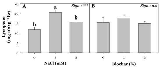 Effect of saline irrigation (A) with three NaCl levels (0, 40 and 80 mM) and biochar treatment (B) at three different concentrations (0, 1, and 2%) on lycopene content. Mean comparisons were performed by Tukey’s HSD post-hoc test. Different letters within each column indicate significant differences between means (p ≤ 0.05). n.s and *** denote non-significant and significant effects at p ≤ 0.001, respectively (n = 3).