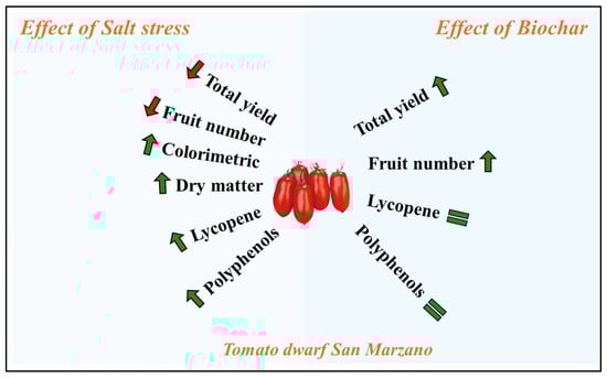 Schematic graphical representation of how the yield and organoleptic properties of varying concentration of biochar (0, 1, and 2% v/v) impact the yield and quality of a dwarf tomato San Marzano ecotype irrigated with brackish water at different salinity levels (0, 40, and 80 mM NaCl).