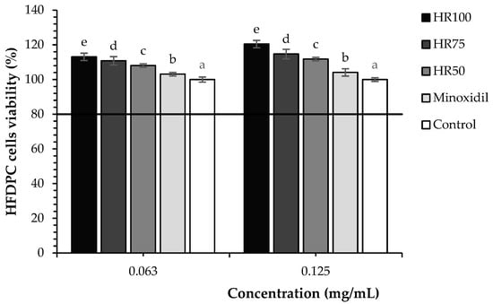 The effect of Hair RiseTM microemulsions and standard controls (minoxidil) at concentrations of 0.063 and 0.125 mg/mL on the proliferation of HFDPCs was compared to untreated cells. Values were presented as the mean ± SD for measurements for each group. A one-way ANOVA was used for statistical analysis, followed by Tukey’s HSD test. Statistical differences (p < 0.05) in cell proliferation among samples at each treatment concentration (0.063 and 0.125 mg/mL) are indicated by different letters (a–e). HR100: 100% of Hair RiseTM microemulsion; HR75: Hair RiseTM microemulsion at a concentration of 75% (v/v) in water; HR50: Hair RiseTM microemulsion at a concentration of 50% (v/v) in water.