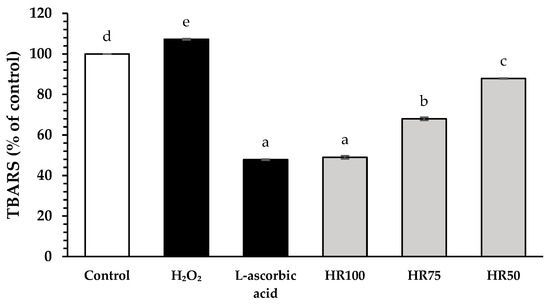 Effects of Hair RiseTM microemulsions and standard controls (L-ascorbic acid) at the concentration of 0.5 mg/mL on the malondialdehyde production in hydrogen peroxide (H2O2)-induced HFDPCs using the thiobarbituric acid reactive substances (TBARS) assay. HR100: 100% Hair RiseTM microemulsion; HR75: Hair RiseTM microemulsion at a concentration of 75% (v/v) in water; HR50: Hair RiseTM microemulsion at a concentration of 50% (v/v) in water. Values are presented as the mean ± SD for triplicates in each sample. A one-way ANOVA was used for statistical analysis, followed by Tukey’s HSD test. Statistical differences (p < 0.05) are represented by different letters (a–e).