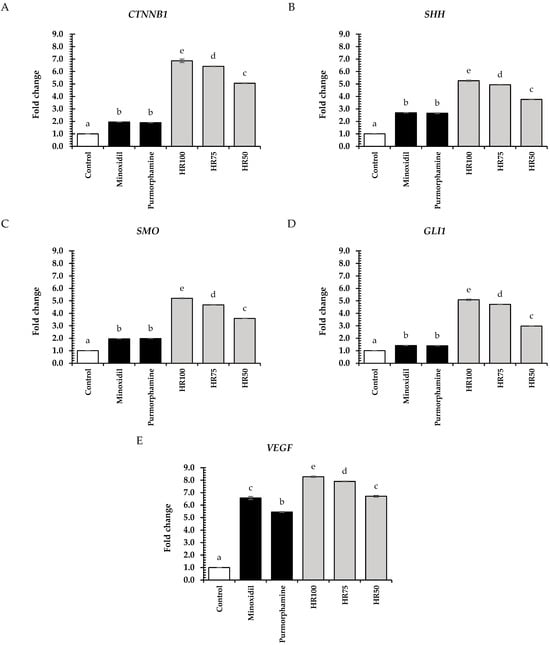 Effects of Hair RiseTM microemulsions and standard control (minoxidil and purmorphamine) (0.5 mg/mL) on the relative mRNA expression of genes associated with Wnt/β-catenin signaling (A) CTNNB1; Sonic Hedgehog pathways (B) SHH; (C) SMO; (D); GLI1; and angiogenesis (E) VEGF in HFDPCs. HR100: 100% Hair RiseTM microemulsion; HR75: Hair RiseTM microemulsion at a concentration of 75% (v/v) in water; HR50: Hair RiseTM microemulsion at a concentration of 50% (v/v) in water. The results are shown as a fold change in gene expression relative to the untreated cells (control group). A one-way ANOVA was used for statistical analysis, followed by Tukey’s HSD test. Statistical differences (p < 0.05) are represented by different letters (a–e).