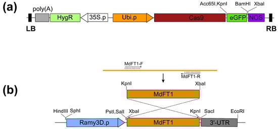 To obtain genetic material for rice transformation, two genes of interest (GOI), eGFP and MdFT1, were cloned into two binary expression vectors driven by different promoter systems. The eGFP gene was fused to Cas9 under the control of the rice ubiquitin promoter (Ubi) with the NOS as the terminator, resulting in the recombinant expression vector Ubi::Cas9–eGFP (Figure 1a and Figure S1). The MdFT1 gene was cloned into the binary vector in an antisense orientation through homologous recombination, driven by the rice alpha-amylase (Ramy3D) promoter with the 3’-UTR as the terminator creating the Ramy3D::MdFT1 expression vector (Figure 1b). Both binary expression vectors used the same selection marker gene, HygR, which confers hygromycin B resistance. These binary expression vectors were separately transformed into A. tumefaciens EHA105, which was then used for embryogenic callus transformation.