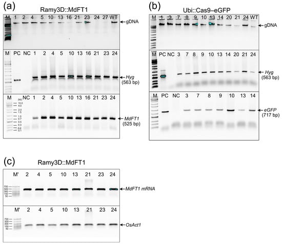 Putative transgenic hygromycin-resistant lines were continuously propagated on N6SE via subculturing. The calli of the putative transgenic hygromycin-resistant lines were sampled for screening using gDNA PCR (Figure 3 and Figure S2). To screen transgenic callus lines with the introduced Ram3D::MdFT1 vector, a specific primer set for MdFT1 amplification (set 3, Table 1), which amplified a 525-bp fragment (Figure 3a), was used. To screen transgenic callus lines expressing Ubi::Cas9–eGFP, a specific primer set for eGFP amplification (set 2, Table 1) was used to amplify a 717-bp fragment (Figure 3b). Additionally, the presence of HygR selection marker gene in both Ram3D::MdFT1 and Ubi::Cas9–eGFP was confirmed using a pair of primers (set 1, Table 1), which amplified the 563-bp fragment (Figure 3a,b). Moreover, RT–PCR analysis of MdFT1 mRNA in transgenic calli showed that MdFT1 was transcribed in rice cells (Figure 3c).
