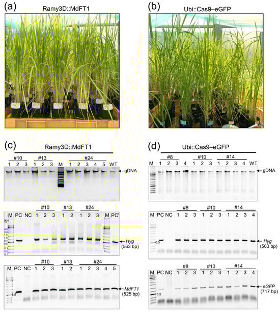 Stable and inherited expression of transgenes in transgenic plants is crucial for the successful establishment of genetically modified crops. To determine whether the target genes introduced into the rice genome could be stably transmitted to the offspring, gDNA PCR amplification was performed. T1 generation plants were generated from seeds harvested from T0 transgenic plants, which were germinated in soil and cultivated in a glasshouse (Figure 4a,b). Leaves of T1 transgenic plants were sampled for gDNA PCR. For molecular confirmation, 20 lines were sampled from the progeny of Ram3D::MdFT1 and Ubi::Cas9–eGFP plants. Successful integration of the T-DNA region into the rice genome was assessed based on the presence of target genes (MdTFL1 and eGFP) and a selection marker gene (HygR). Following the same procedure as that used for the PCR screening of transgenic callus lines, transgenes in the T1 progeny were detected in Ram3D::MdFT1 (Figure 4c) and Ubi::Cas9–eGFP (Figure 4d) plants. This indicated that the transgene was consistently inherited and remained stable across generations. The transgenic plants were grown for seed harvesting and further analysis.