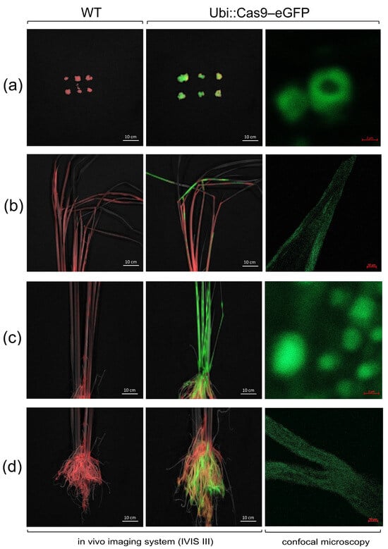 Observation of green fluorescent protein (eGFP) in rice calli (a) and various organs of T1 seedlings expressing Ubi::Cas9–eGFP, including leaves (b), stems (c), and roots (d), compared to WT plants. The GFP imaging data were processed using a program sequence that included an automatic unmixing method for all wavelengths, along with a manual unmixing method at 488 nm excitation and emission ranging from 504 to 770 nm, in the IVIS Lumina III system. The cellular eGFP fluorescence in transgenic rice was visualized using a blue filter via the confocal microscopy (described in Section 4.9). The green color is the green fluorescence of GFP and the red color is autofluorescence signals.