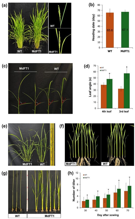 Phenotyping of transgenic rice expressing Ramy3D::MdFT1 compared to WT ‘Dongjin’ cultivar. The analysis includes evaluation of heading dates (a,b), leaf angle (c,d), branching at vegetative developmental stage (e,f), branching at harvest stage (g), and the number of tillers during different developmental stages (h). Data are presented as means ± standard deviations (SD) (n ≥ 20). Asterisks indicate significant differences (p < 0.05).