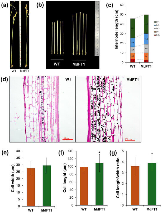 Furthermore, transgenic Ramy3D::MdFT1 rice exhibited greater total height and internode length than the WT rice (Figure 7a–c). This may be because the introduction of MdFT1 affects cell development. To investigate this, cells in the elongation zone of the internode stem were examined under a light microscope, and their sizes were measured to identify differences (Figure 7d–g). Cell size differed between the transgenic and WT plants. Although the cell widths were similar, the cell length of the transgenic plants was significantly greater than that of the WT.