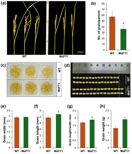 Evaluation of yield potential in transgenic rice expressing MdFT1. Rice panicles at ripening stage (a) with yield potential (number of grains per panicle) (b). Seed production was measured with 100 grains (c). Grain size (d–g) and the average weight of 100 grains (h) were also assessed. Data are presented as means ± SD. Asterisks indicate significant differences (p < 0.05). Scale bars = 3 cm.